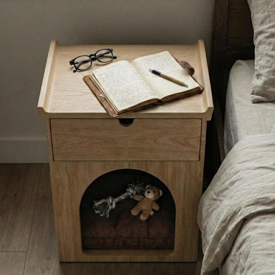상판 + 서랍 + 하우스의 3 in 1 구조. 서랍에 반려동물 용품과 리모컨 등 소품 정리 가능.