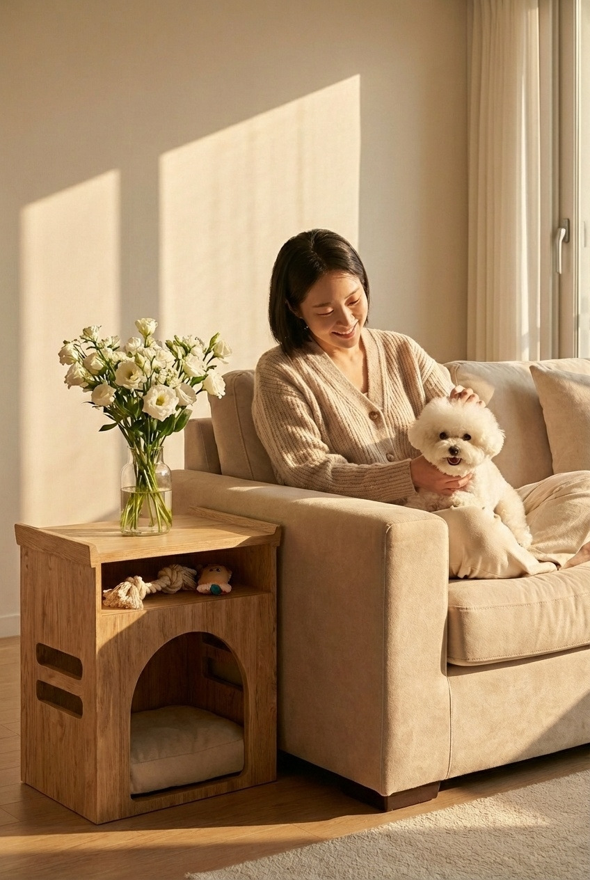 사랑하는 아이를 위해 비워 둔 작은 자리, 다시 만날 날을 기다리며 준비해 두는 보금자리. 반려와 나를 위한 원목 가구 Corner House Fit입니다.